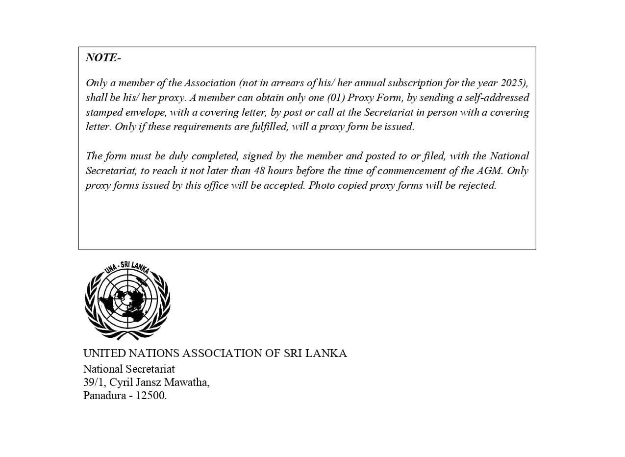 The 76th Annual General Meeting of UNA Sri Lanka by Tuan Rizan Adahan | Jan 19, 2026 | Media Releases | 0 comments Submit a Comment Cancel replyYour email address will not be published. Required fields are marked *Comment * Name * Email * Website Save my name, email, and website in this browser for the next time I comment.